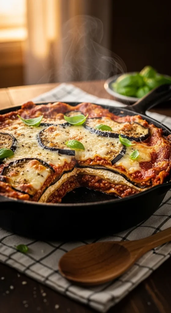 Roasted eggplant adds a soft, smoky layer that blends beautifully with rich beef sauce.