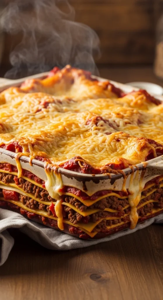 The beef sauce simmers slowly to develop bold flavor, while the cheese melts into soft, creamy layers.