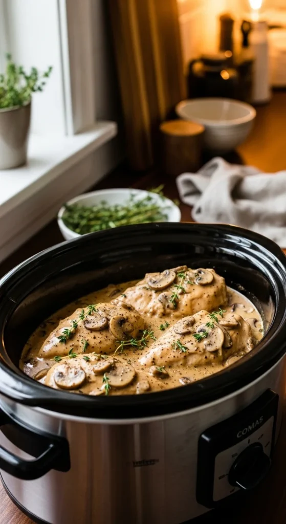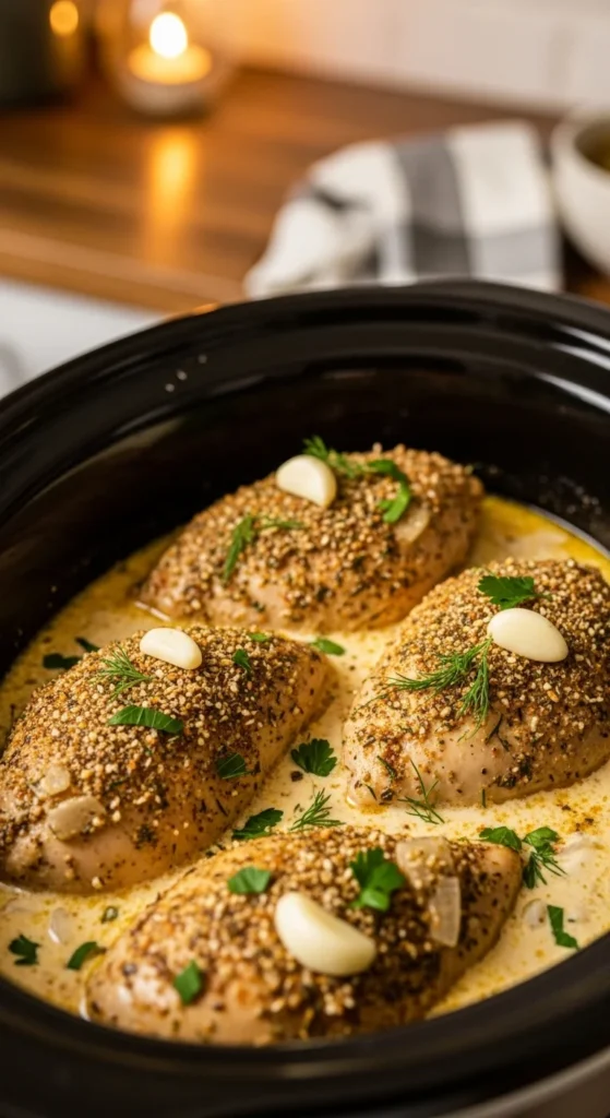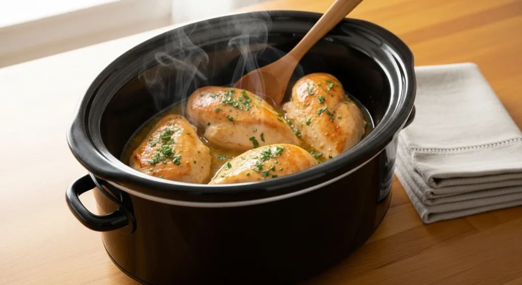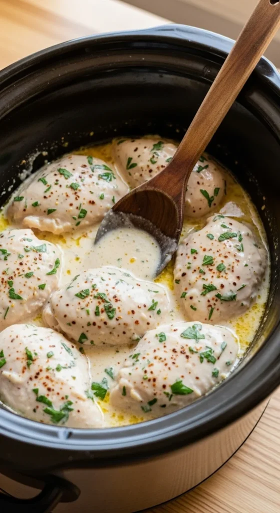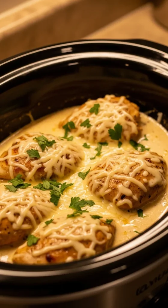 This creamy garlic Parmesan chicken is rich, comforting, and perfect for busy weeknights. The slow cooker blends garlic, butter, and cheese into a smooth sauce while keeping the chicken moist and tender. It works beautifully over pasta, rice, or even roasted vegetables.