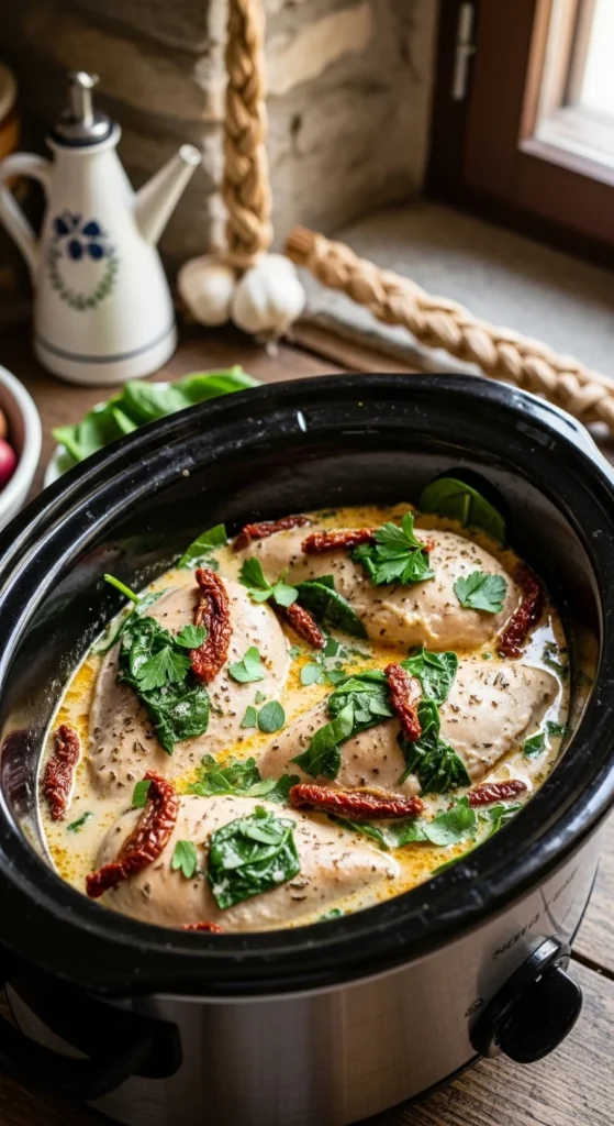 This Mediterranean-inspired dish combines creamy sauce, garlic, spinach, and tangy sun-dried tomatoes for a bold yet comforting dinner. It tastes like something from a cozy Italian kitchen but requires only minutes of prep.