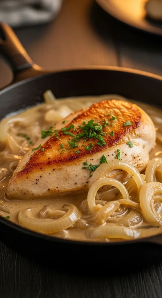 Slow-cooked onions melt into a smooth, comforting sauce. The chicken stays juicy as it simmers gently. The flavor feels mild and soothing. Easy to prepare. Great for evenings when you want something calm. Pairs well with starches.
