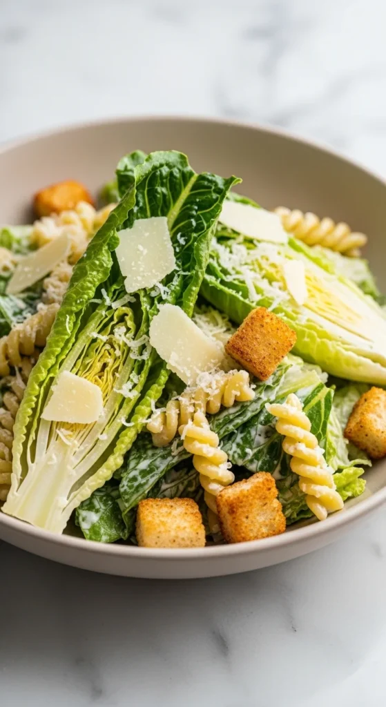 This Caesar pasta salad blends creamy dressing with pasta and crisp greens, creating a familiar dish that works well for quick lunches.