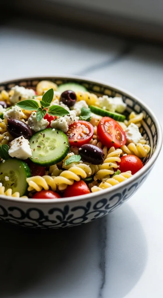 This Greek-inspired pasta salad brings fresh vegetables, briny olives, and creamy feta together for a bright dish that feels refreshing yet filling. The simple vinaigrette ties everything together and the flavors develop beautifully after chilling, making it perfect for make-ahead meals.