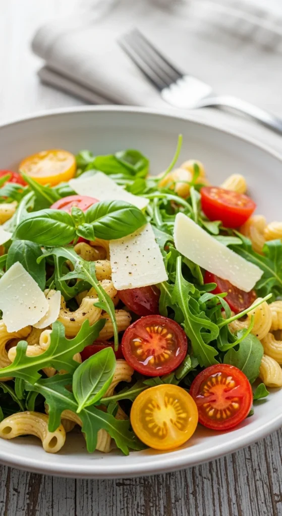 This arugula pasta salad adds a peppery bite that keeps the dish light yet flavorful.