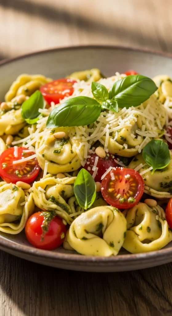 This pesto pasta salad is rich, comforting, and quick thanks to store-bought tortellini and pesto. The sauce coats every bite, creating a creamy texture without heavy ingredients, making it ideal for fast dinners.