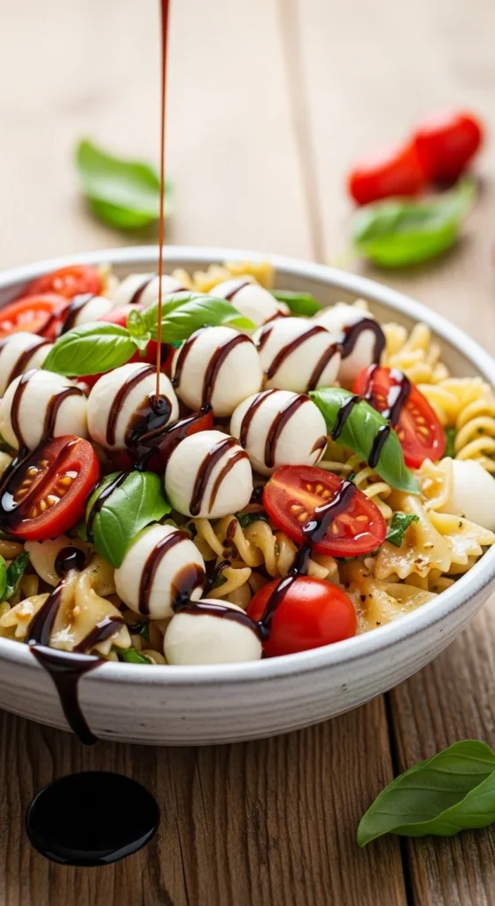 Drizzle extra balsamic before serving. Add basil leaves on top. Serve with grilled chicken. Works well for potlucks. Finish with parmesan.