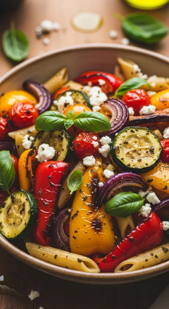 Roasting vegetables brings out deep flavors that pair beautifully with the bright dressing.