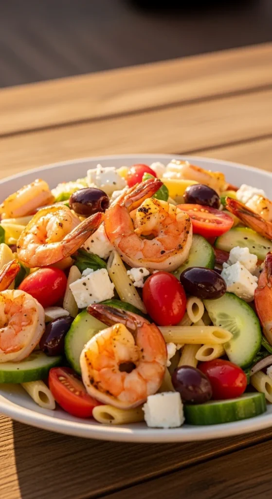 This seafood twist adds tender, slightly smoky shrimp that pairs beautifully with the bright lemon dressing and crisp vegetables, making it feel light yet satisfying for warm days or special lunches. The combination of textures—from juicy shrimp to crunchy cucumbers—keeps every bite interesting and refreshing.