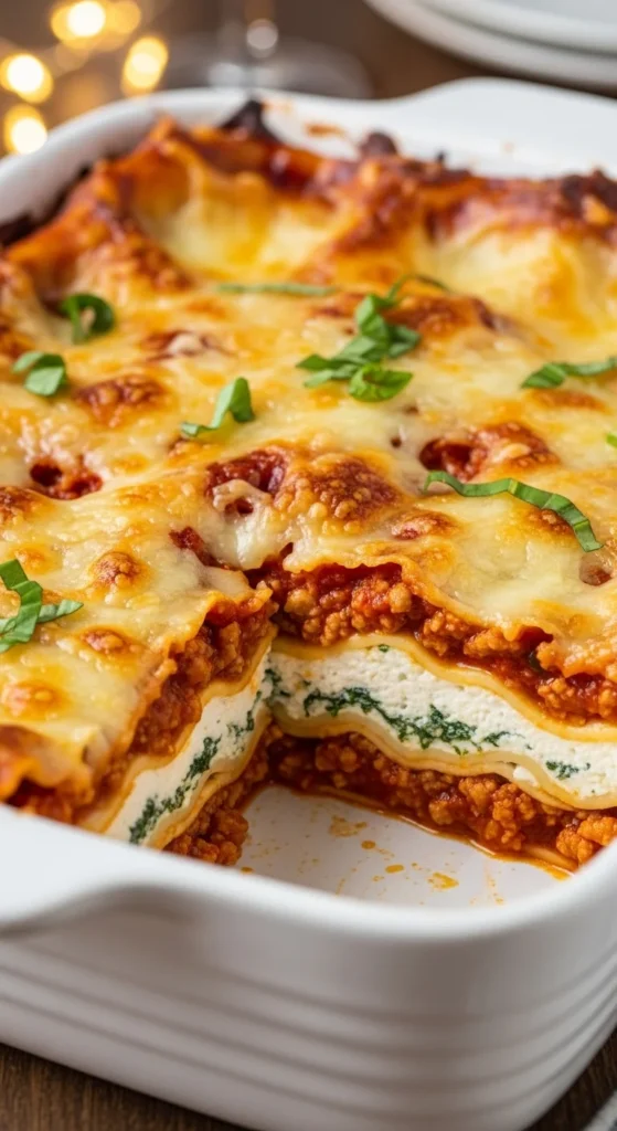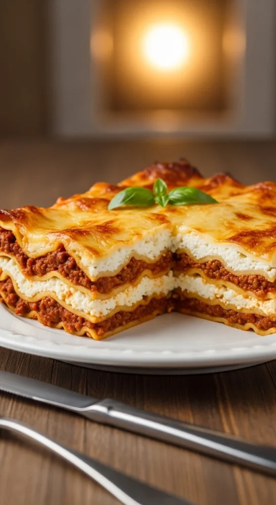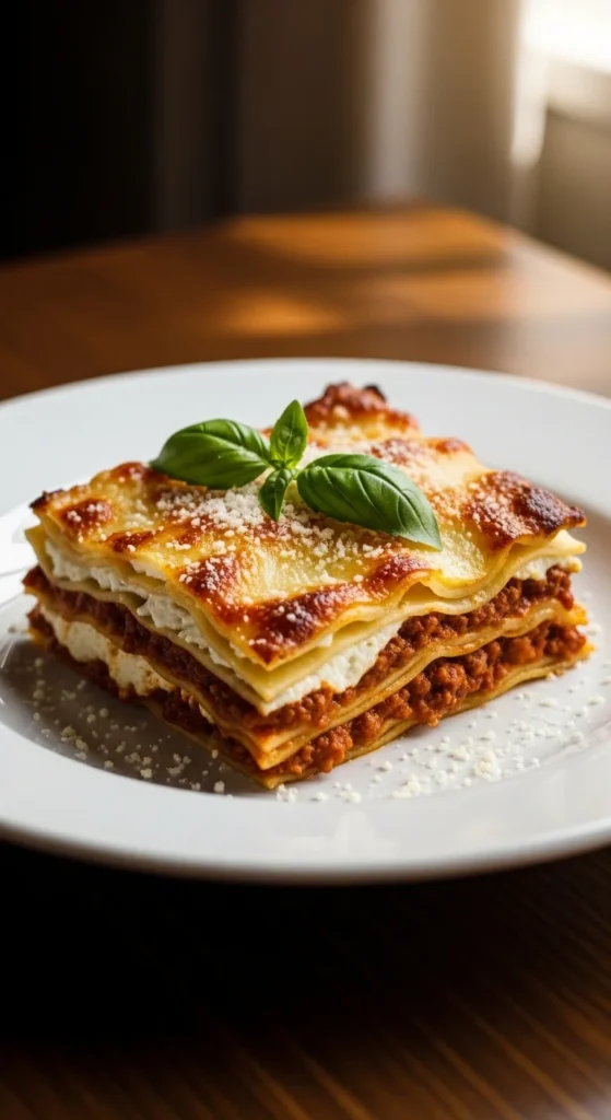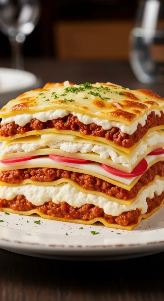Serve with chopped parsley, basil, or extra Parmesan on top. This is the kind of lasagna that belongs at the center of the table with bread and salad nearby. It’s especially good for Sunday dinners and holidays. Let it rest before slicing so the layers stay nice and tidy. Spoon a little extra sauce around the slice for a beautiful plate. Save leftovers because they taste even better the next day.