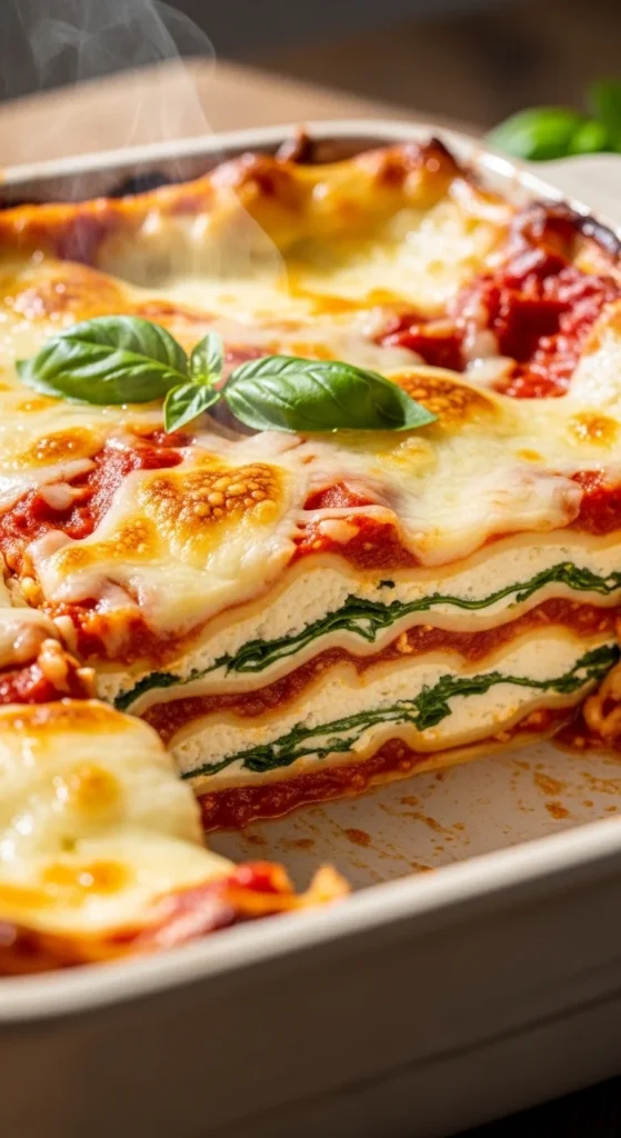 This spinach ricotta lasagna is creamy, cozy, and packed with tender spinach folded into a rich cheese filling, giving the pan a fresh green contrast against the red sauce and melted topping, while still keeping the soft layered texture that makes lasagna so satisfying, which makes it a lovely meatless option for family dinners, guests, or make-ahead meals during the week.
