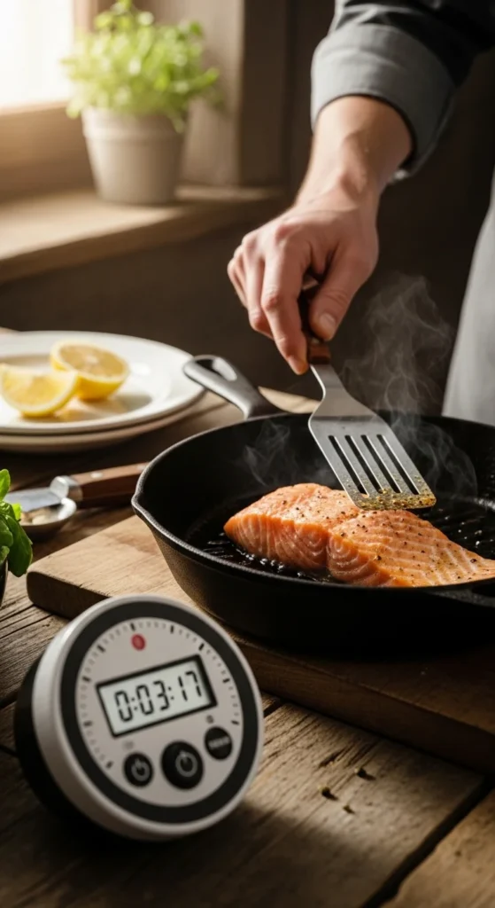 The right setup makes a huge difference in how your salmon cooks. A cast iron skillet gives you the best crispy skin, while a good nonstick pan is perfect for beginners who want easy flipping.