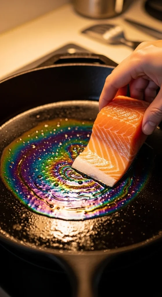 Drop a tiny piece of salmon → it should sizzle immediately.