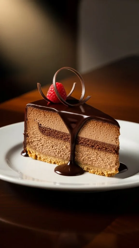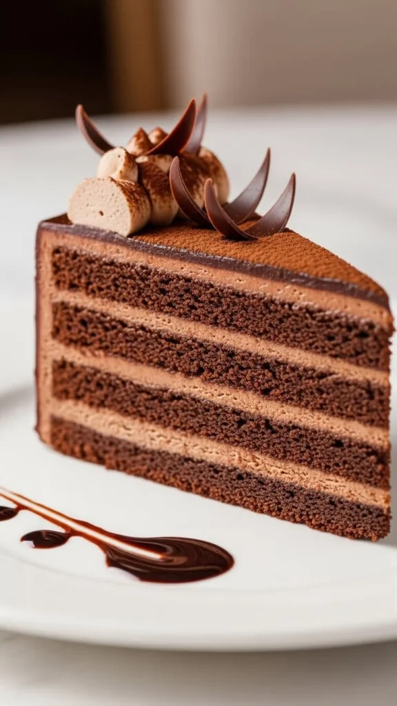 Dust with cocoa before serving. Slice cleanly. Serve chilled. Add chocolate curls if desired.