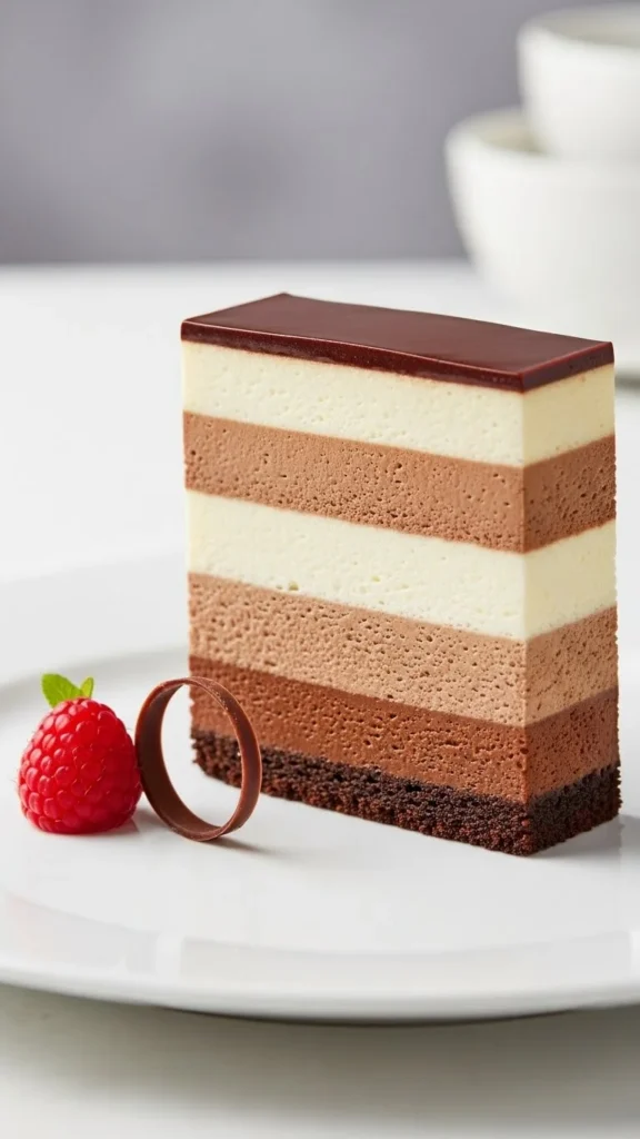 Light mousse layers give this cake a smooth, airy texture.