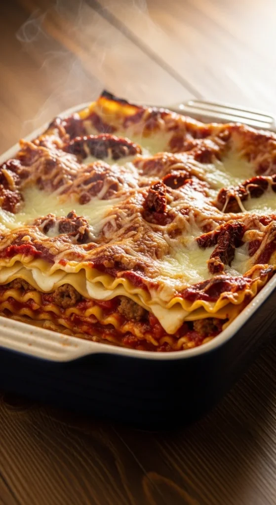 This lasagna has a deep, tangy flavor from sun-dried tomatoes that blend perfectly with savory sausage. The richness of the sauce feels slightly sweet, slightly smoky, and very satisfying. It’s a bold twist on classic lasagna that still feels familiar. Each layer is packed with intense flavor and soft, cheesy texture. Great for dinner gatherings or meal prep.