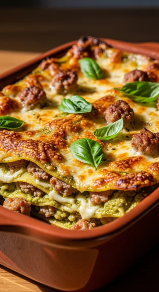 This lasagna blends fresh basil pesto with sausage for a bright, herbal flavor. The green pesto layers bring freshness while cheese adds creaminess. It feels lighter yet still rich and satisfying. Perfect for spring or summer meals.