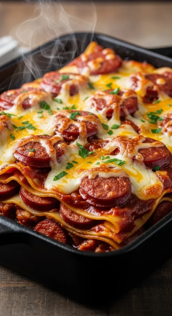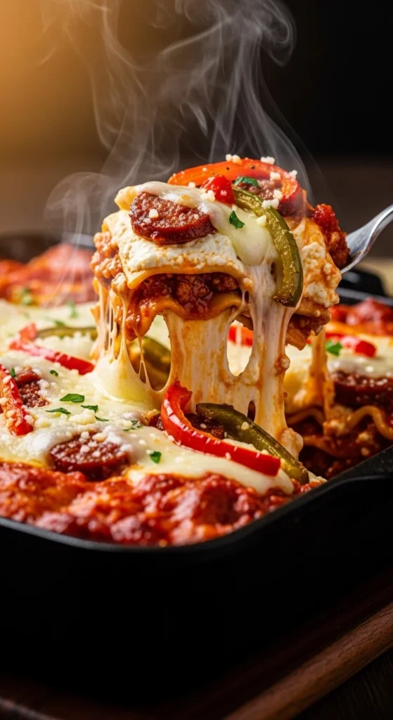 This recipe balances sweet Italian sausage with tangy tomato sauce for a smooth, comforting taste. The sweetness blends into the cheese layers, giving a mellow but rich bite that feels homemade and satisfying.